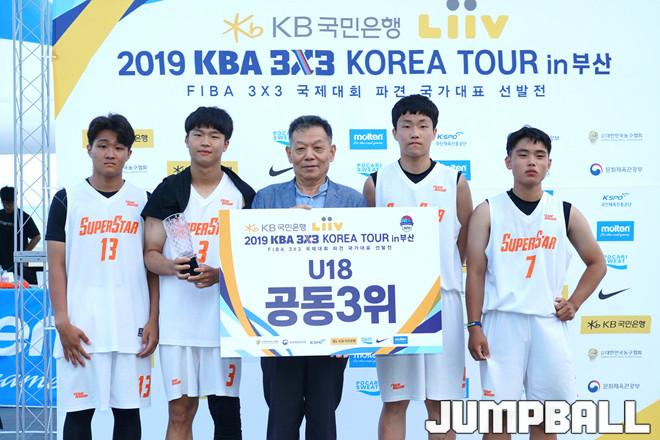[점프볼=부산/홍기웅 기자] 14일 해운대 해수욕장 특설코트에서 열린 'KB국민은행 리브 2019 KBA 3X3 코리아 투어 부산'. U18 공동 3위로 팀 슈퍼스타가 수상했다.