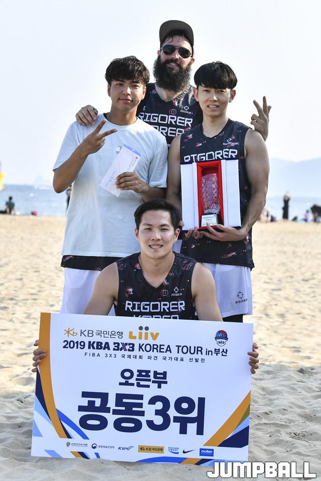 [점프볼=부산/홍기웅 기자] 14일 해운대 해수욕장 특설코트에서 열린 'KB국민은행 리브 2019 KBA 3X3 코리아 투어 부산'. 오픈부 공동 3위로 리고러코리아가 수상했다.