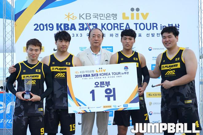 [점프볼=부산/홍기웅 기자] 14일 해운대 해수욕장 특설코트에서 열린 'KB국민은행 리브 2019 KBA 3X3 코리아 투어 부산'. 오픈부 우승으로 모션스포츠가 수상했다.