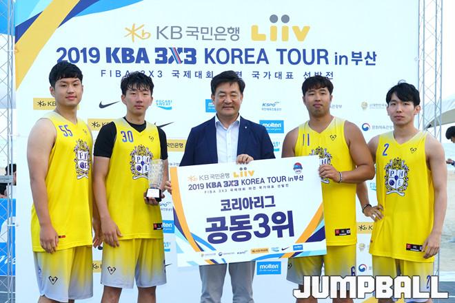 [점프볼=부산/홍기웅 기자] 14일 해운대 해수욕장 특설코트에서 열린 'KB국민은행 리브 2019 KBA 3X3 코리아 투어 부산'. 리그전 공동 3위로 PHE가 수상했다.