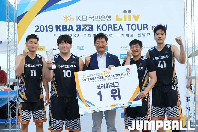 [점프볼=부산/홍기웅 기자] 14일 해운대 해수욕장 특설코트에서 열린 'KB국민은행 리브 2019 KBA 3X3 코리아 투어 부산'. 리그전 우승으로 리고러코리아가 수상했다.