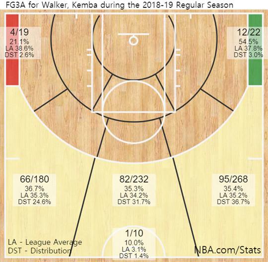 이와 함께 워커도 어빙처럼 볼 없는 움직임이 좋다. 다른 것이 있다면 활동영역이 다르다는 점이다. 외곽 옵션이 부재한 샬럿 팀 플랜의 결과물일 수도 있지만 워커는 외곽플레이의 비중이 높은 선수다. 커리어 평균 2.1개(3P 35.7%)의 3점 성공을 기록하고 있는 워커는 지난 시즌 평균 3.2개(3P 35.6%) 3점 성공으로, 커리어 하이를 기록했다. 위 3점 성공률 분포도에서 알 수 있듯 워커는 3점 라인 전 지역에 고른 성공률을 기록하고 있다. 주목할 부분은 워커가 3점을 만드는 과정을 보면 볼 없는 움직임을 활용한 패턴이 많다는 점이다. 보스턴에는 워커 외에도 고든 헤이워드·마커스 스마트가 메인 볼 핸들러와 패서역할을 맡을 수 있다. 제이슨 테이텀도 지난 시즌 돌파에 이은 킥아웃 패스를 공격옵션에 장착하는 등 슈터를 살릴 수 있다. 이에 일각에선 동료의 도움을 받을 워커가 샬럿에 있을 때보다 더 효율적인 슈터로 변신할 수 있다 전망하고 있다.