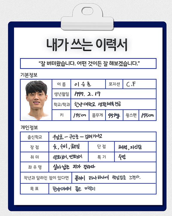 [점프볼=강현지 기자] 2019 KBL 국내신인선수 드래프트에 나오는 예비 프로들이 쓰는 취업이력서. 열다섯 번째 주인공은 한양대 블루워커 이승훈(F, 195cm)이다. 농구선수로서 구력이 짧아 아직 그를 모르는 이들이 많다. ‘이승훈이 누구야’라는 물음에 그는 “살아남는 자가 강하다”라는 자신의 좌우명을 언급하며 마지막까지 부족한 점을 보완해 자신을 알릴 것이라 힘줘 말했다.