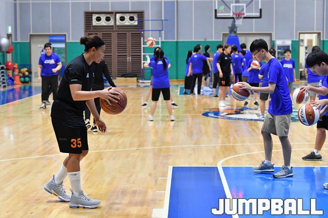 [점프볼=용인/홍기웅 기자] 24일 삼성트레이닝센터에서 열린 '2019년 삼성생명 블루밍스와 함께하는 농구강습회'. 삼성생명 김한별이 장애인 학생들에게 드리블을 가르쳐주고 있다.