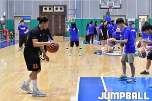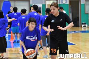 [점프볼=용인/홍기웅 기자] 24일 삼성트레이닝센터에서 열린 '2019년 삼성생명 블루밍스와 함께하는 농구강습회'. 삼성생명 김한비가 장애인 학생에게 공을 건네고 있다.