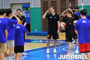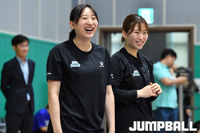 [점프볼=용인/홍기웅 기자] 24일 삼성트레이닝센터에서 열린 '2019년 삼성생명 블루밍스와 함께하는 농구강습회'. 경기도 장애인 체육회 학생들과 삼성생명 선수들이 스타팀과 홍팀으로 반으로 나눠 연습게임을 펼쳤다. 삼성생명 이주연과 안주연이 스타팀이 슛을 연속해서 득점하자 활짝 웃으며 바라보고 있다.