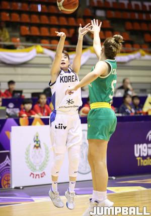 26일 태국 방콕 유스 센터에서 열린 2019 U19여자농구 월드컵 한국과 모잠비크의 9-16위 결정전, 한국 대표팀의 에이스 박지현이 적극적인 공격으로 팀 공격을 이끌고 있다.