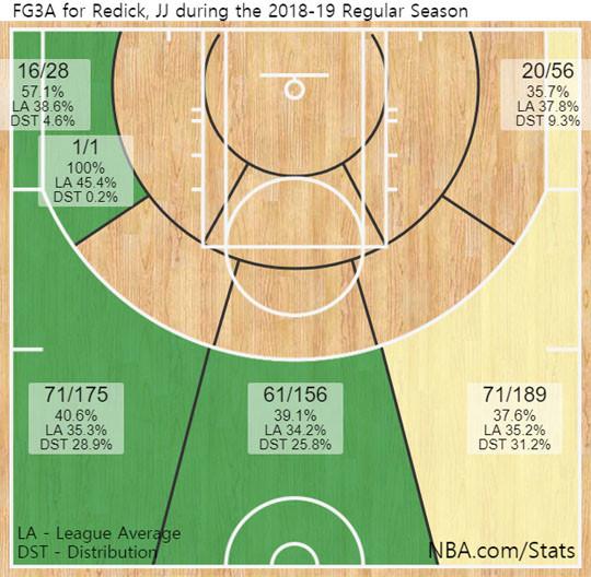 #2018-2019시즌 정규리그 J.J 레딕 3점 성공률 분포도