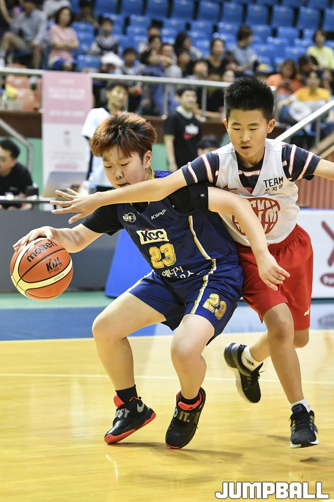 [점프볼=군산/홍기웅 기자] 28일 군산월명체육관에서 열린 'KCC이지스배 유소년 페스티바 IN 군산' 우지원농구교실과 군산 Jr. KCC의 경기. 군산 KCC가 파워를 동반한 포스트업으로 골밑으로 들어가고 있다.