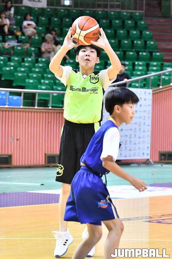 [점프볼=군산/홍기웅 기자] 28일 군산월명체육관에서 열린 'KCC이지스배 유소년 페스티바 IN 군산' 전주 Jr.KCC와 익산 스포츠매니저의 경기. 익산 스포츠매니저가 투핸드 점프슛을 던지고 있다.