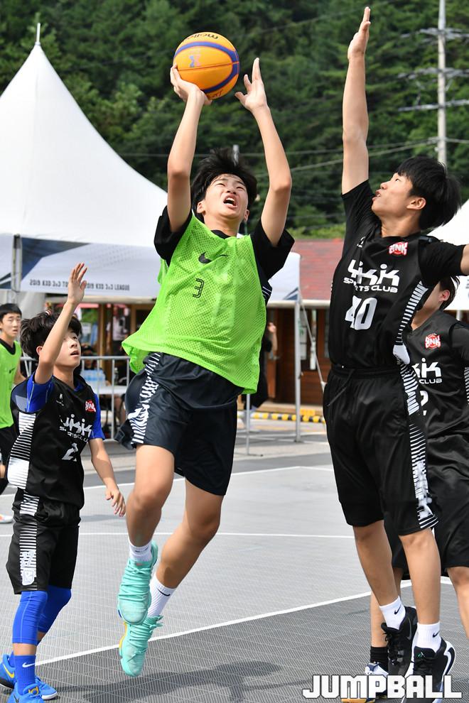 [점프볼=평창/홍기웅 기자] 3일 평창 대화면 평창더위사냥축제 특설코트에서 열린 '2019 KXO 3X3 리그 4라운드 평창' U15 예선 원주YKK B와 원주YKK C의 경기. YKK B가 골밑슛을 올려넣고 있다.