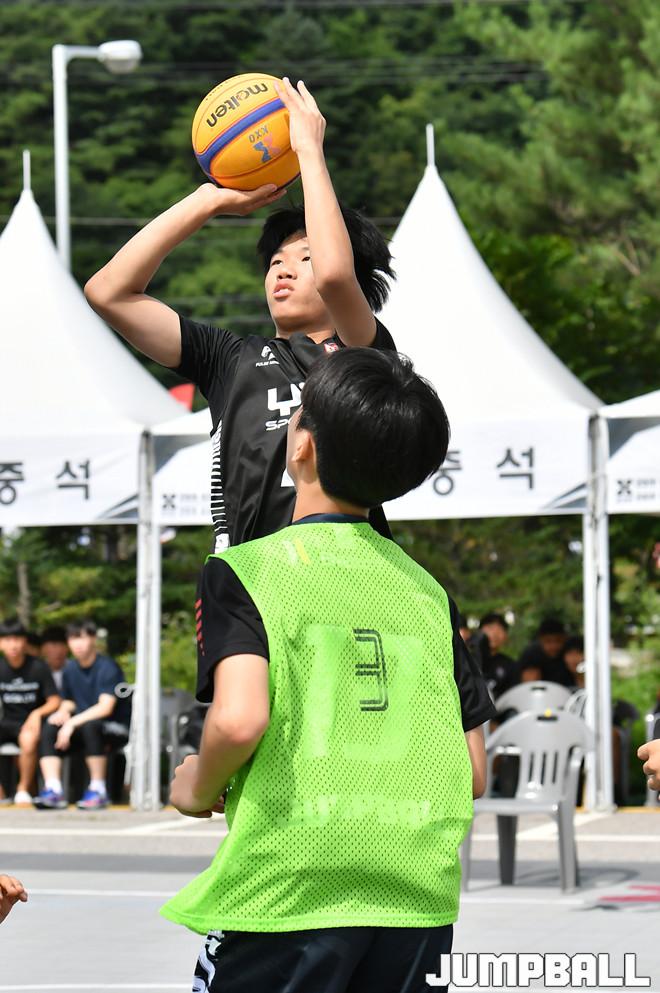 [점프볼=평창/홍기웅 기자] 3일 평창 대화면 평창더위사냥축제 특설코트에서 열린 '2019 KXO 3X3 리그 4라운드 평창' U15 예선 원주YKK B와 원주YKK C의 경기. YKK C가 점프슛을 던지고 있다.