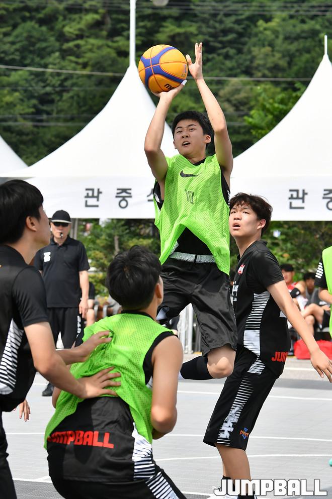 [점프볼=평창/홍기웅 기자] 3일 평창 대화면 평창더위사냥축제 특설코트에서 열린 '2019 KXO 3X3 리그 4라운드 평창' U15 예선 원주YKK B와 원주YKK C의 경기. YKK B가 점프슛을 던지고 있다.