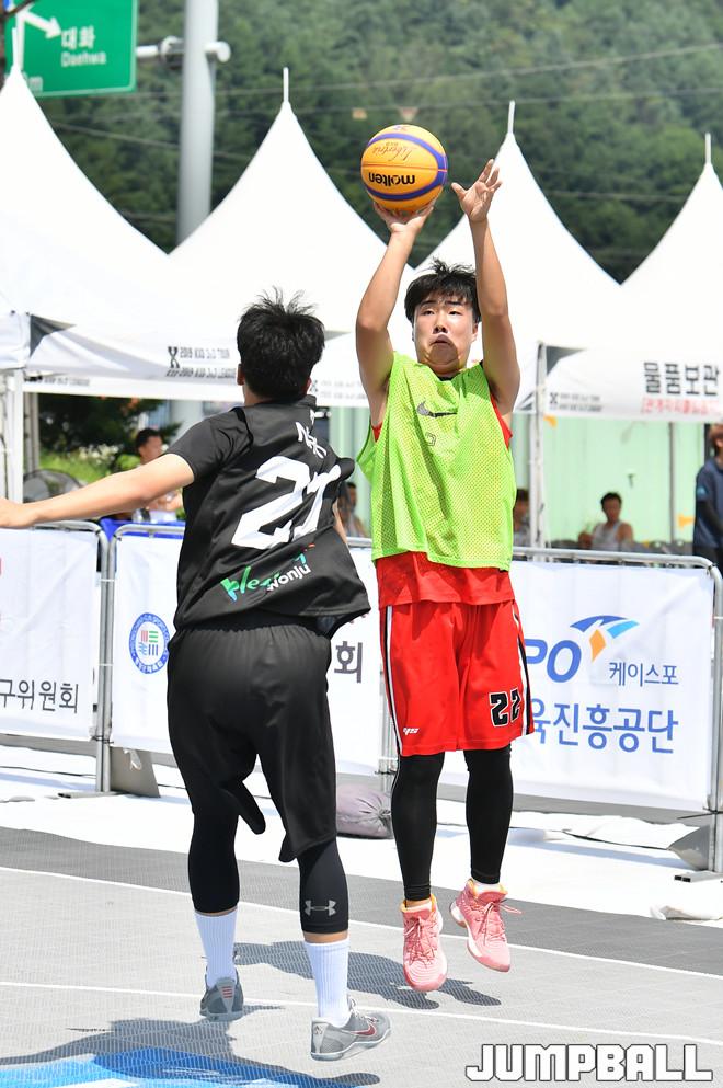 [점프볼=평창/홍기웅 기자] 4일 평창 대화면 평창더위사냥축제 특설코트에서 열린 '2019 KXO 4라운드 평창' U18 원주시티와 클린샷의 경기. 클린샷이 외곽슛을 던지고 있다.