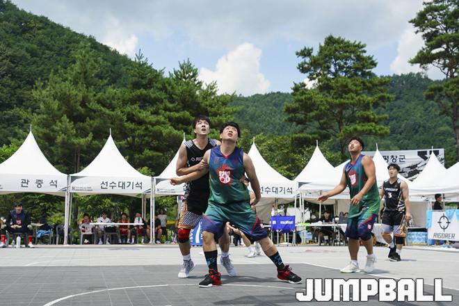 [점프볼=평창/홍기웅 기자] 4일 평창 대화면 평창더위사냥축제 특설코트에서 열린 '2019 KXO 4라운드 평창' 리그전 PHE와 리고러코리아의 경기. PHE와 리고러코리아가 리바운드를 잡아내기 위해 위치 경합을 펼치고 있다.