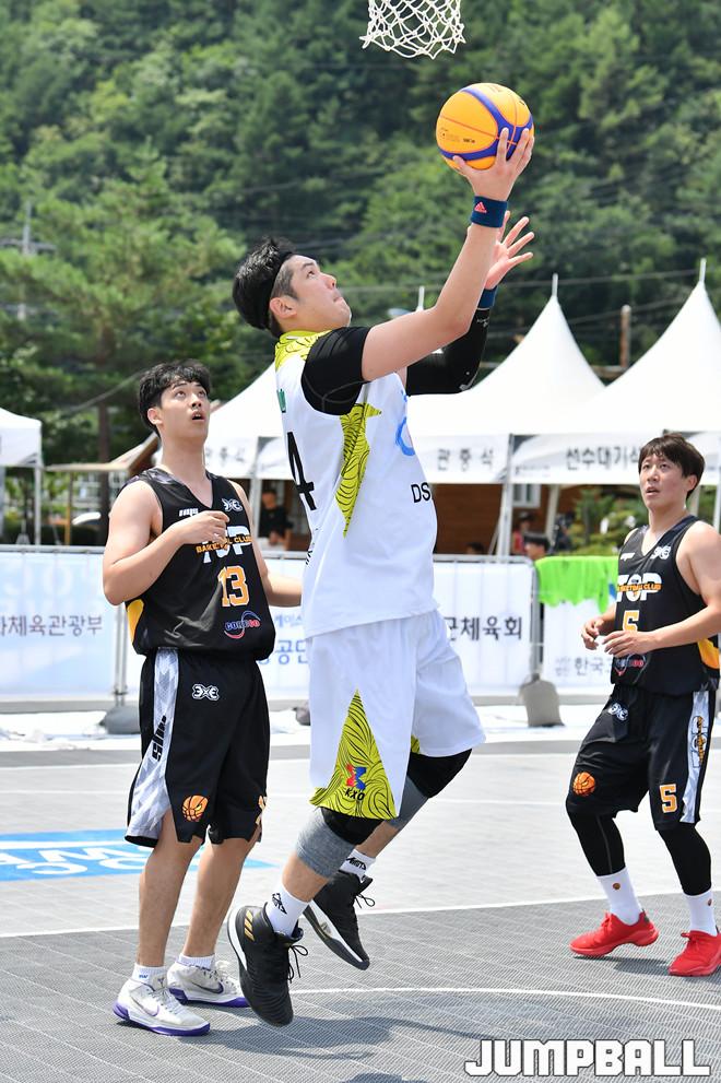 [점프볼=평창/홍기웅 기자] 4일 평창 대화면 평창더위사냥축제 특설코트에서 열린 '2019 KXO 4라운드 평창' 리그전 DSB와 안산TOP의 경기. DSB 박용환이 리버스 레이업을 넣고 있다.