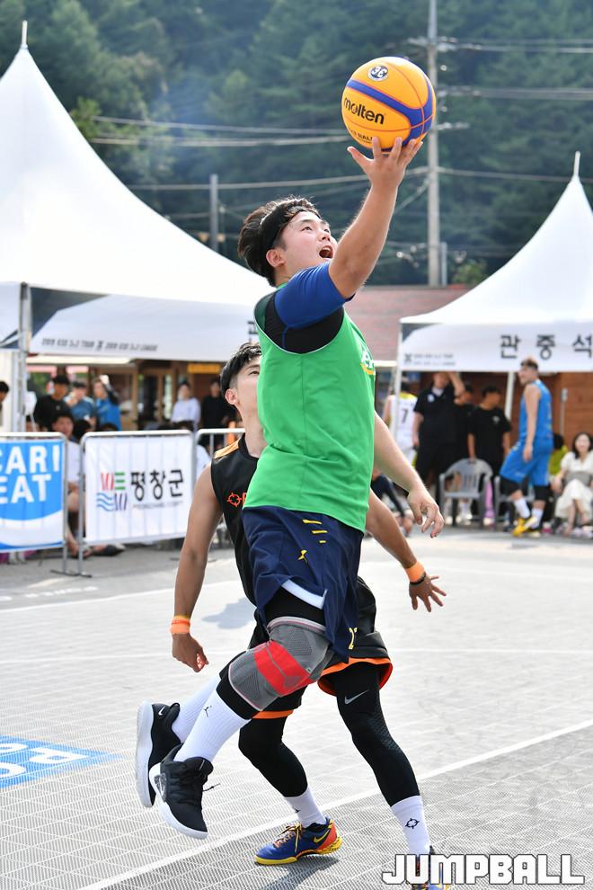 [점프볼=평창/홍기웅 기자] 4일 평창 대화면 평창더위사냥축제 특설코트에서 열린 '2019 KXO 4라운드 평창' 오픈부 결승 리고러코리아와 ANSB의 경기. ANSB가 레이업을 시도하고 있다.