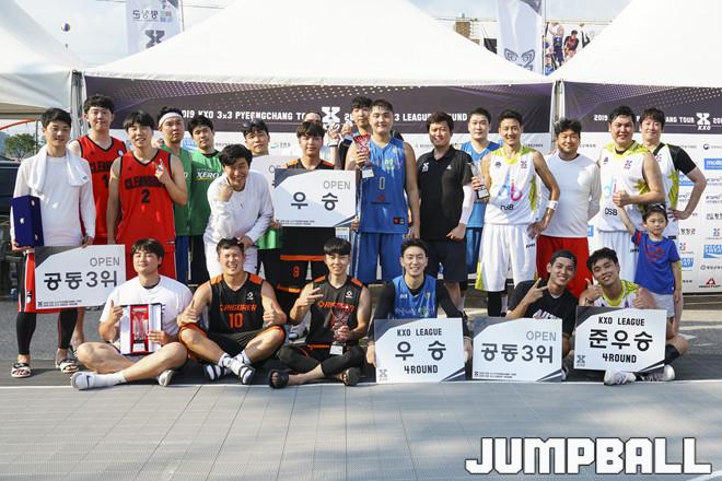 [점프볼=평창/홍기웅 기자] 4일 평창 대화면 평창더위사냥축제 특설코트에서 열린 '2019 KXO 4라운드 평창'. KXO 3X3리그 4라운드 평창을 마무리하고 오픈부와 리그부 수상팀들이 단체사진을 촬영하고 있다.