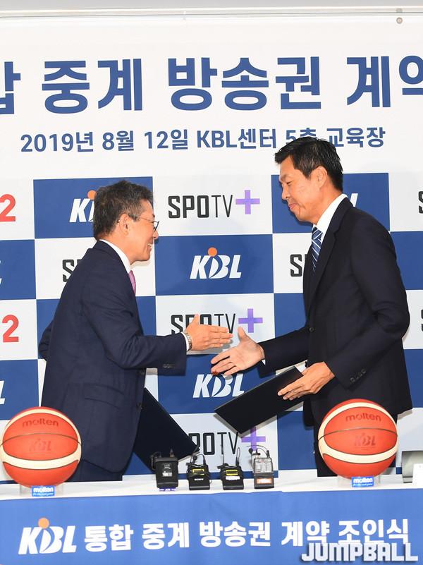 [점프볼=논현/문복주 기자] 12일 논현동 KBL센터 5층 교육장에서 KBL 통합 중계 방송권 조인식으로 KBL은 에이클라 엔터테인먼드와 2019-2020시즌부터 2023-2024시즌까지 총 5시즌 간 프로농구 방송권 계약을 체결했다.