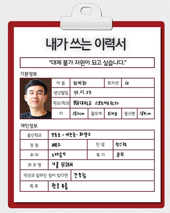 [점프볼=강현지 기자] 2019 KBL 국내신인선수 드래프트에 나오는 예비 프로들이 쓰는 취업이력서. 열여덟 번째 주인공은 경희대 최재화(G, 180cm)다. 지난해 프로조기진출을 결심하고, 신인선수 드래프트에 참가한 최재화는 결국 구단들의 부름을 받지 못하고, 경희대로 돌아갔다. 한 번의 좌절은 그에게 전화위복이 됐다. 부족한 점을 보완할 동기부여가 됐던 것. 다시 도전 앞에 선 최재화를 만나 2018년 11월 26일, 드래프트 이후 이야기를 들어봤다.