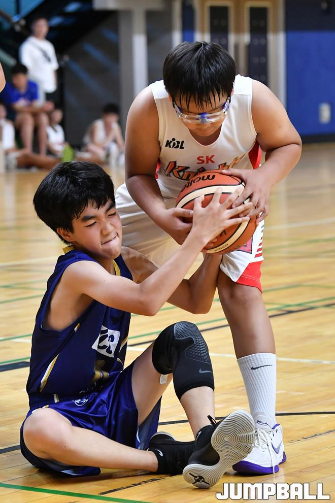 [점프볼=문경/홍기웅 기자] 15일 문경실내체육관에서 열린 '2019 KBL 유소년클럽농구대회 IN 문경' 고학년 B조 SK와 KCC의 경기. 초등부 고학년 KCC와 SK 선수가 치열한 루즈볼 경합을 펼치고 있다.