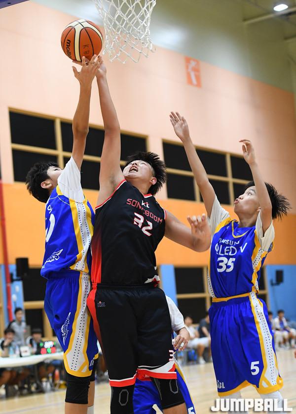 [점프볼=문경/문복주 기자] 15일 문경배드민턴장에서 열린 '2019 KBL 유소년클럽 농구대회"로 (중B) KT와 삼성의 경기, KT 박경진이 공격리바운드를 다투고 있다.