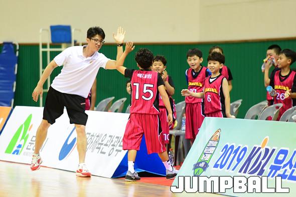 [점프볼=문경/박상혁 기자] 15일 국군체육부대 선승관에서 열린 '2019 KBL 유소년클럽 농구대회" 초등부 저학년 LG와 삼성의 경기, LG 배대범이 코치와 하이파이브를 하고 있다.
