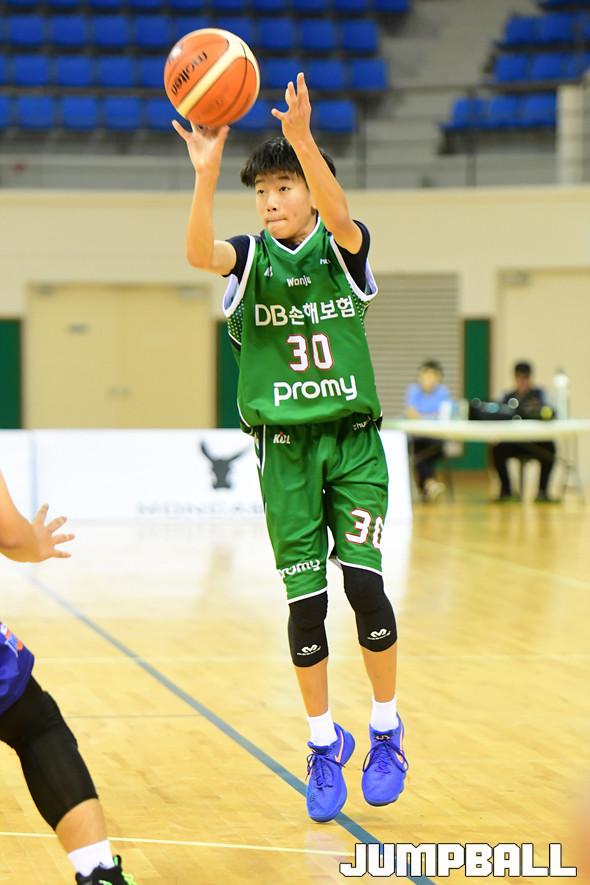[점프볼=문경/박상혁 기자] 16일 국군체육부대 선승관에서 열린 '2019 KBL 유소년클럽 농구대회" KCC와 DB의 중등부 A조 경기, DB 허민서가 3점슛을 시도하고 있다.