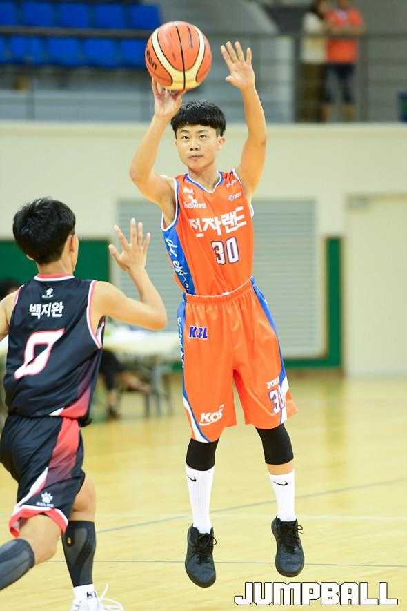 [점프볼=문경/박상혁 기자] 16일 국군체육부대 선승관에서 열린 '2019 KBL 유소년클럽 농구대회" 전자랜드와 KT의 중등부 B조 경기, 전자랜드 이승민이 3점슛을 시도하고 있다.