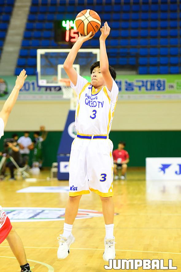 [점프볼=문경/박상혁 기자] 16일 국군체육부대 선승관에서 열린 '2019 KBL 유소년클럽 농구대회" SK와 삼성의 중등부 B조 경기, 삼성 정현이 점프슛을 시도하고 있다.
