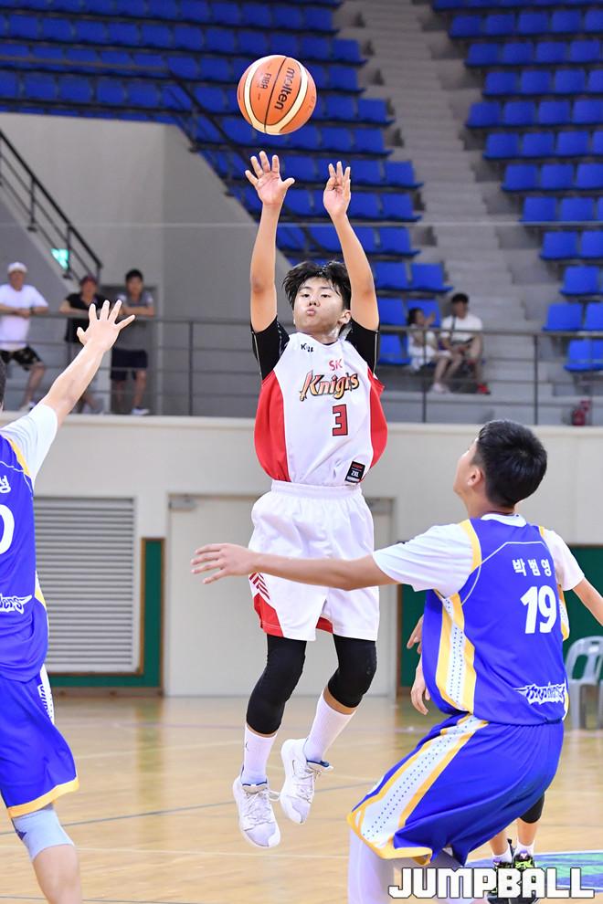 [점프볼=문경/홍기웅 기자] 18일 국군체육부대 선승관에서 열린 '2019 KBL 유소년클럽 농구대회 문경' 중등부 결승 삼성과 SK의 경기. 중등부 SK 박병주가 점프슛을 던지고 있다.