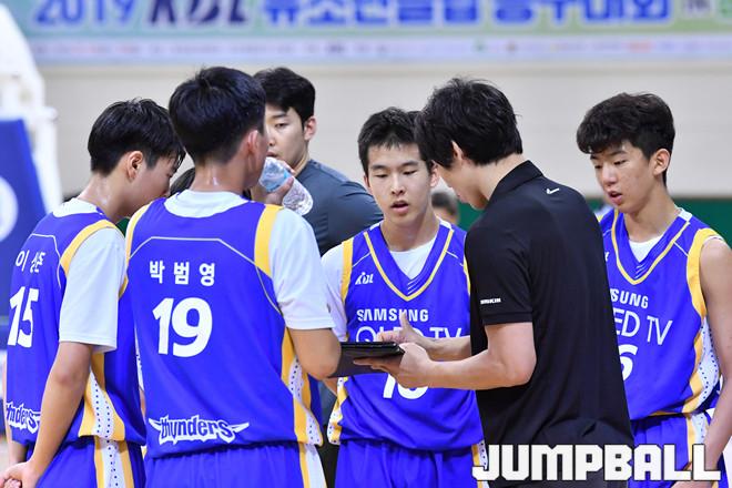 [점프볼=문경/홍기웅 기자] 18일 국군체육부대 선승관에서 열린 '2019 KBL 유소년클럽 농구대회 문경' 중등부 결승 삼성과 SK의 경기. 중등부 삼성이 작전타임을 이용해 작전을 짜고 있다.