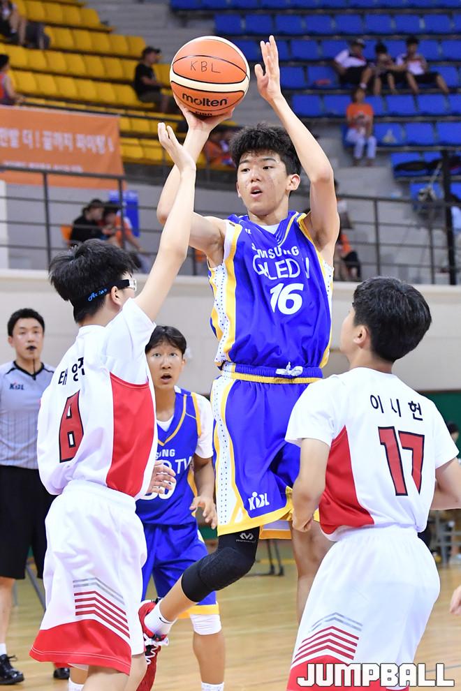 [점프볼=문경/홍기웅 기자] 18일 국군체육부대 선승관에서 열린 '2019 KBL 유소년클럽 농구대회 문경' 중등부 결승 삼성과 SK의 경기. 중등부 삼성 강민성이 골밑 안쪽에 있는 동료를 보고 점프 패스를 건네고 있다.