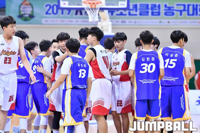 [점프볼=문경/홍기웅 기자] 18일 국군체육부대 선승관에서 열린 '2019 KBL 유소년클럽 농구대회 문경' 중등부 결승 삼성과 SK의 경기. 중등부 SK가 삼성이 우승을 확정짓자 상대편이었던 SK가 포옹을 하며 축하해주고 있다.