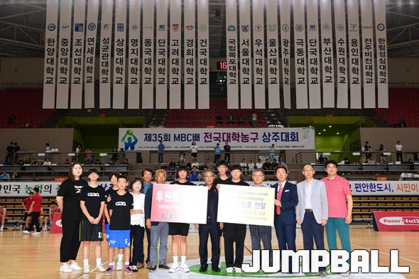 [점프볼=상주/박상혁 기자] 22일 상주실내체육관 신관에서 열린 '제35회 MBC배 전국대학농구 상주대회' 고려대와 중앙대 남대부 결승전 경기, 하프타임에 상주시에 소속되어있는 선수들을 위한 농구용품 전달식이 있었다.