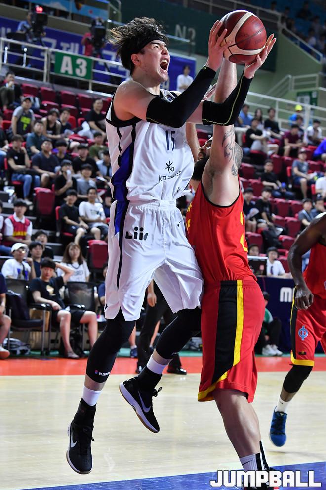 [점프볼=인천/홍기웅 기자] 27일 인천삼산월드체육관에서 열린 '현대모비스 초청 4개국 국제농구대회' 대한민국과 앙골라의 경기. 김종규가 몸을 부딪히며 슛을 올리고 있다.