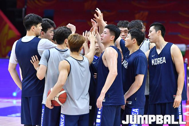 [점프볼=우한(중국)/홍기웅 기자] 29일 중국 우한스포츠센터에서 '2019 FIBA 농구월드컵' 대한민국 대표팀이 첫 훈련을 가졌다. 대표팀이 훈련의 마무리로 손을 모아 화이팅을 외치고 있다.